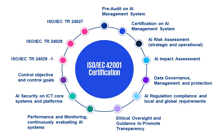 ISO 42001 provides a structured framework for governing AI systems responsibly and transparently. Certification enables organizations to demonstrate conformity with recognized AI governance principles and emerging regulatory expectations, including regional requirements such as the UAE AI guidelines and EU AI Act frameworks.